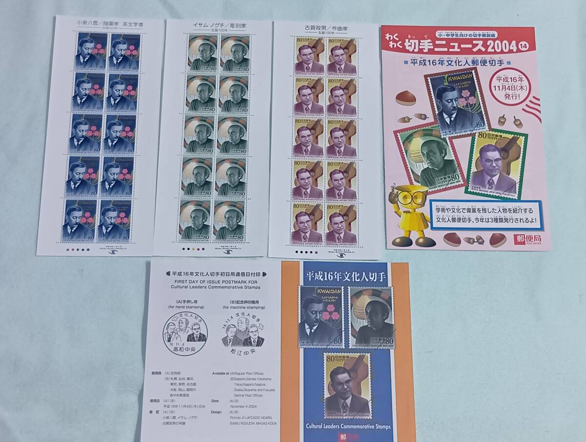 平成16年文化人郵便切手 小泉八雲・イサムノグチ・古賀政男 切手シート各1枚と解説書とわくわく切手ニュース W