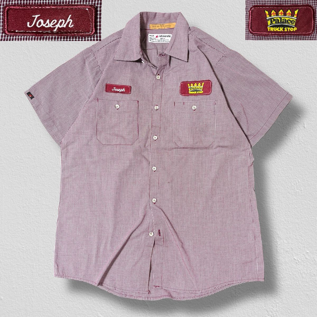 - ARAMARK 半袖ワークシャツ ワッペン Palace TRUCK STOP Joseph ボルドーチェック M ●洗濯プレス済●ネコポス可● シャツ 赤 古着/493