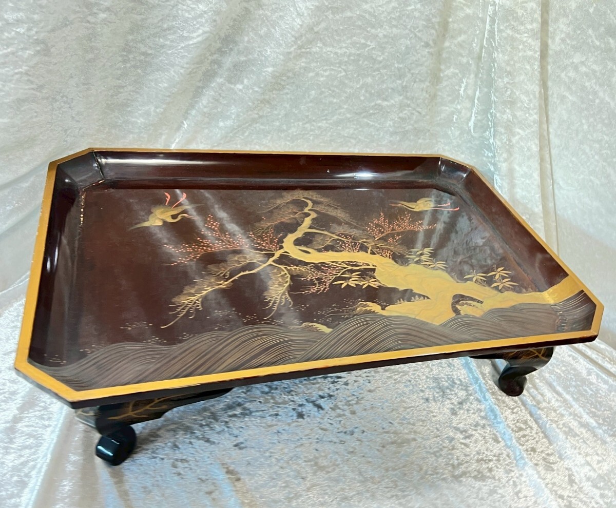 - 【漆器・蒔絵】金蒔絵の大盆 みだれ盆 角盆 松竹梅に双鶴文 高蒔絵 ディスプレイ用品 インテリア用品 骨董品 アンティーク