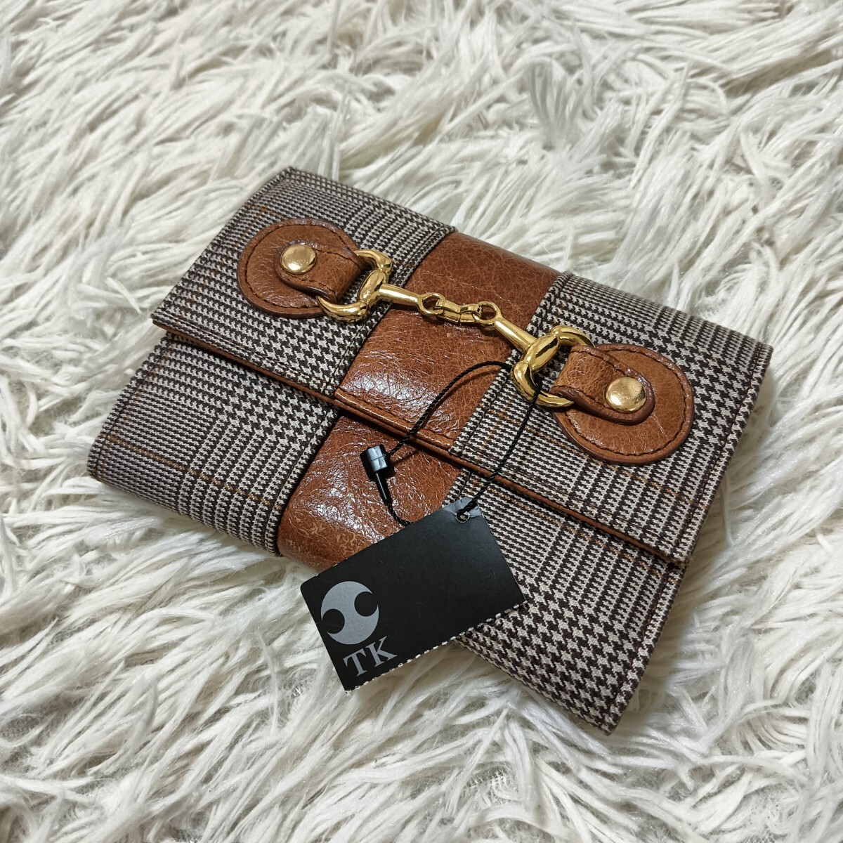 > 美品☆TK TAKEO KIKUCHI タケオキクチ 三つ折り財布 レザー ゴールド金具 グレンチェック 革小物 ユニセックス タグ付 未使用に近い USED