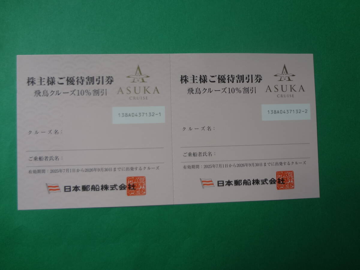 - 日本郵船『飛鳥クルーズ10%割引』株主優待割引券2枚 有効期間(2025年7月1~20026年9月30日に出発するクルーズ)