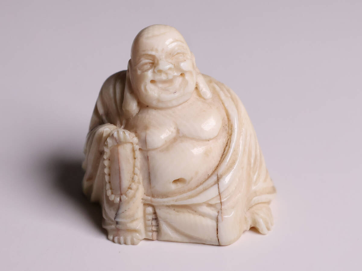 - 時代 布袋様 置物 高3.1cm 17g 天然素材 牙彫 白材 七福神 縁起物 彫刻【CM275】