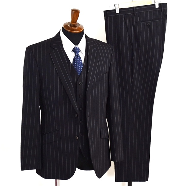 ・春秋対応。ベスト付き。2つボタンシングル。袖口4つ釦開き見せ。総裏地仕上げ。サイドベンツ。フラップポケット。ネーム刺繍なし。