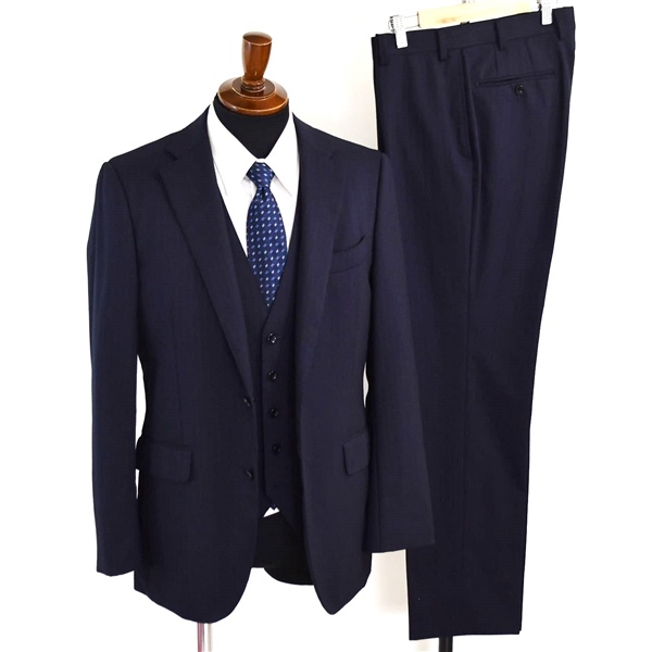・春夏秋対応。ベスト付き。2つボタンシングル。袖口4つ釦本切羽。背抜き。センターベント。フラップポケット。ネーム刺繍なし。