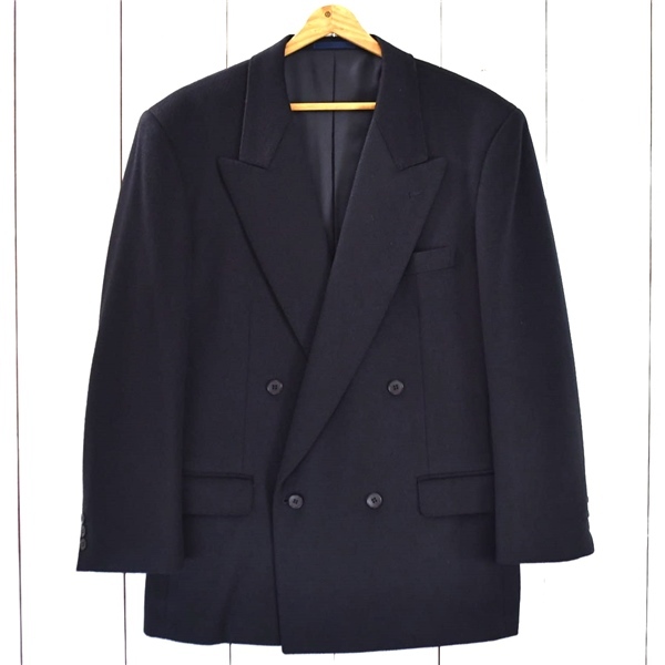 4つボタンダブル。フラップポケット。ノーベント。袖口3つボタン。開き見せ。総裏地仕上げ。ネーム刺繍あり。この機会に是非!