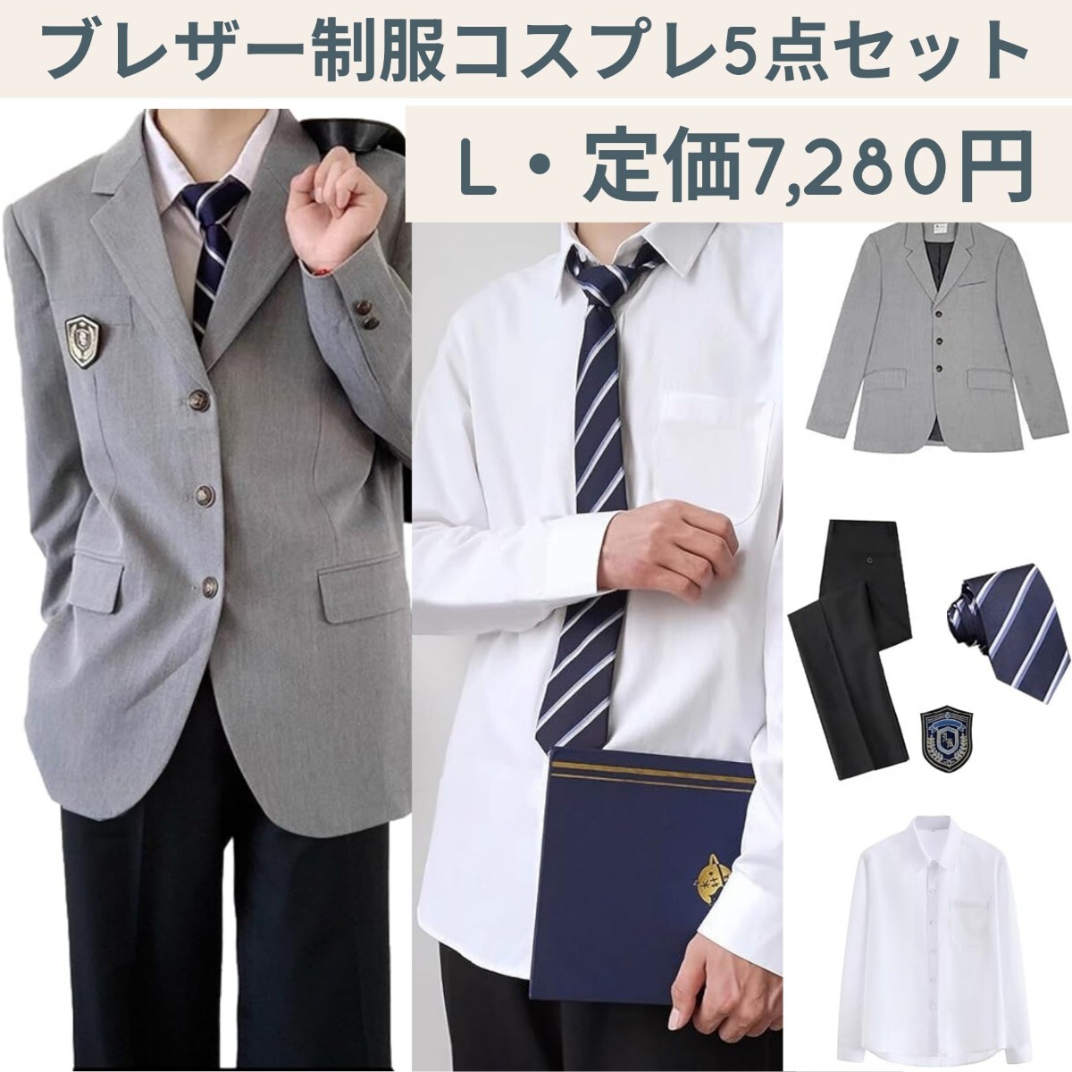 - 新品 定価7,280円 L グレー メンズ用 ブレザー 制服 コスプレ衣装 5点セット ブレザー シャツ ネクタイ ユニセックス 卒業式 入学式 文化祭
