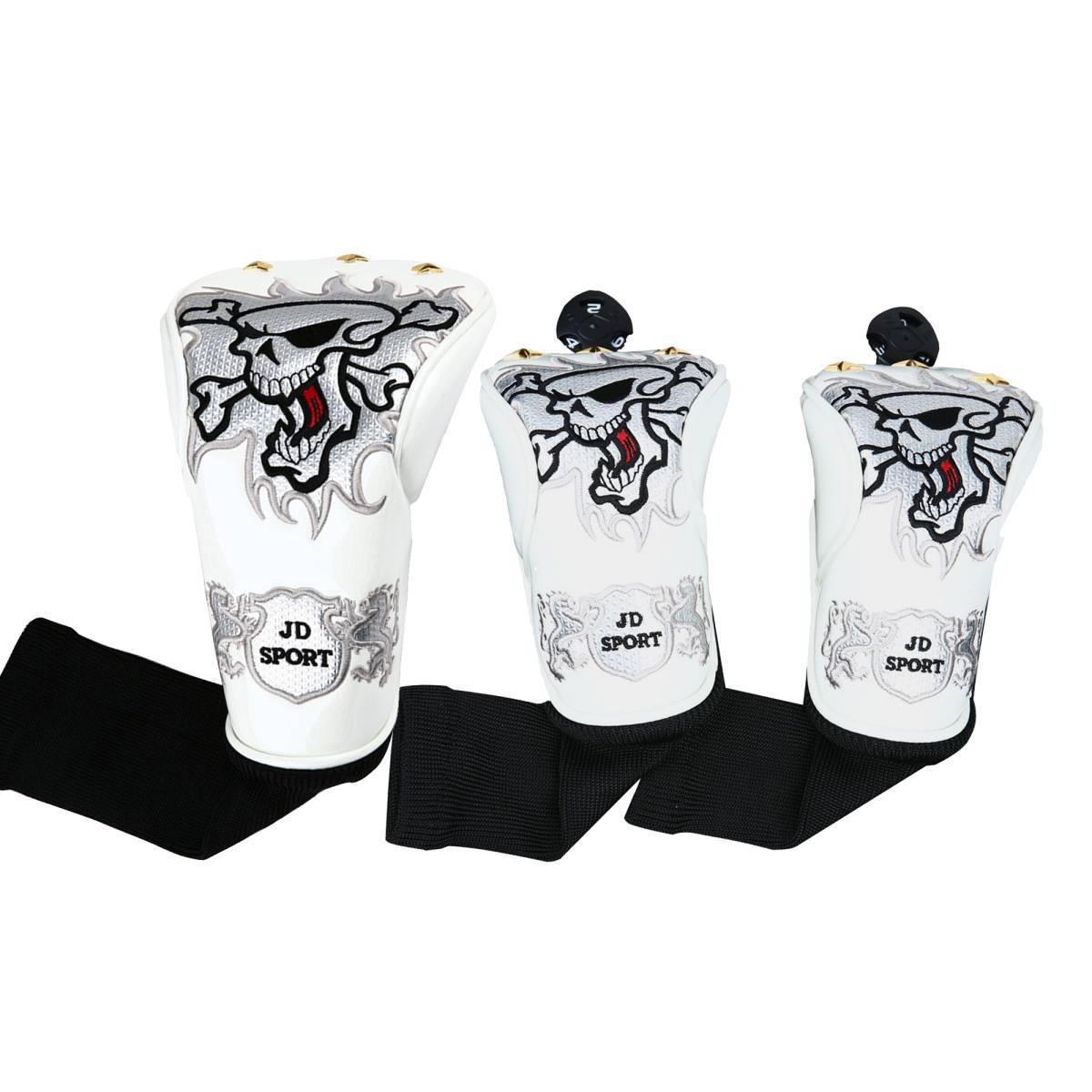 - 高級pu革 ドライバー/ウッド用 FW ヘッドカバー 3点セット スカル模様 刺繍入 防水仕様 変換ダグ付き 白