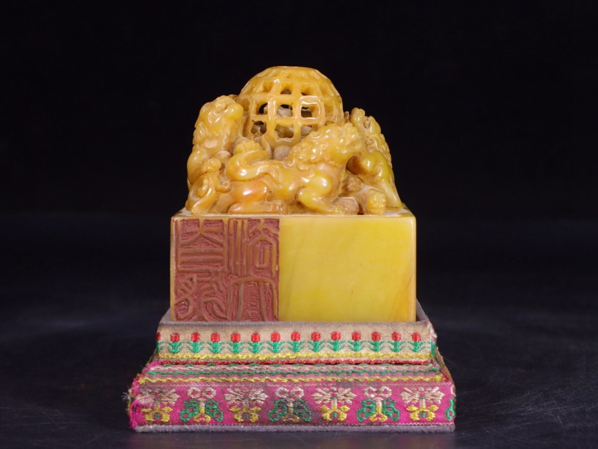 - 「清 黄士陵 老寿山石 田黄石彫り 五獅戲球鈕大印章」極細工 擺件 古賞物 中国古美術 旧蔵出