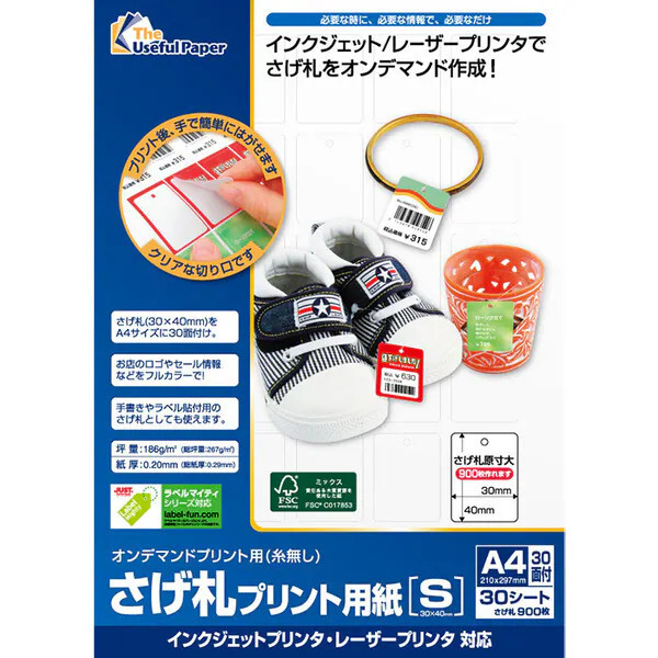 - さげ札プリント用紙[S] UPTPS-30 未使用品 A4サイズ 30面×30シート入り 下げ札900枚 中川製作所製 #1