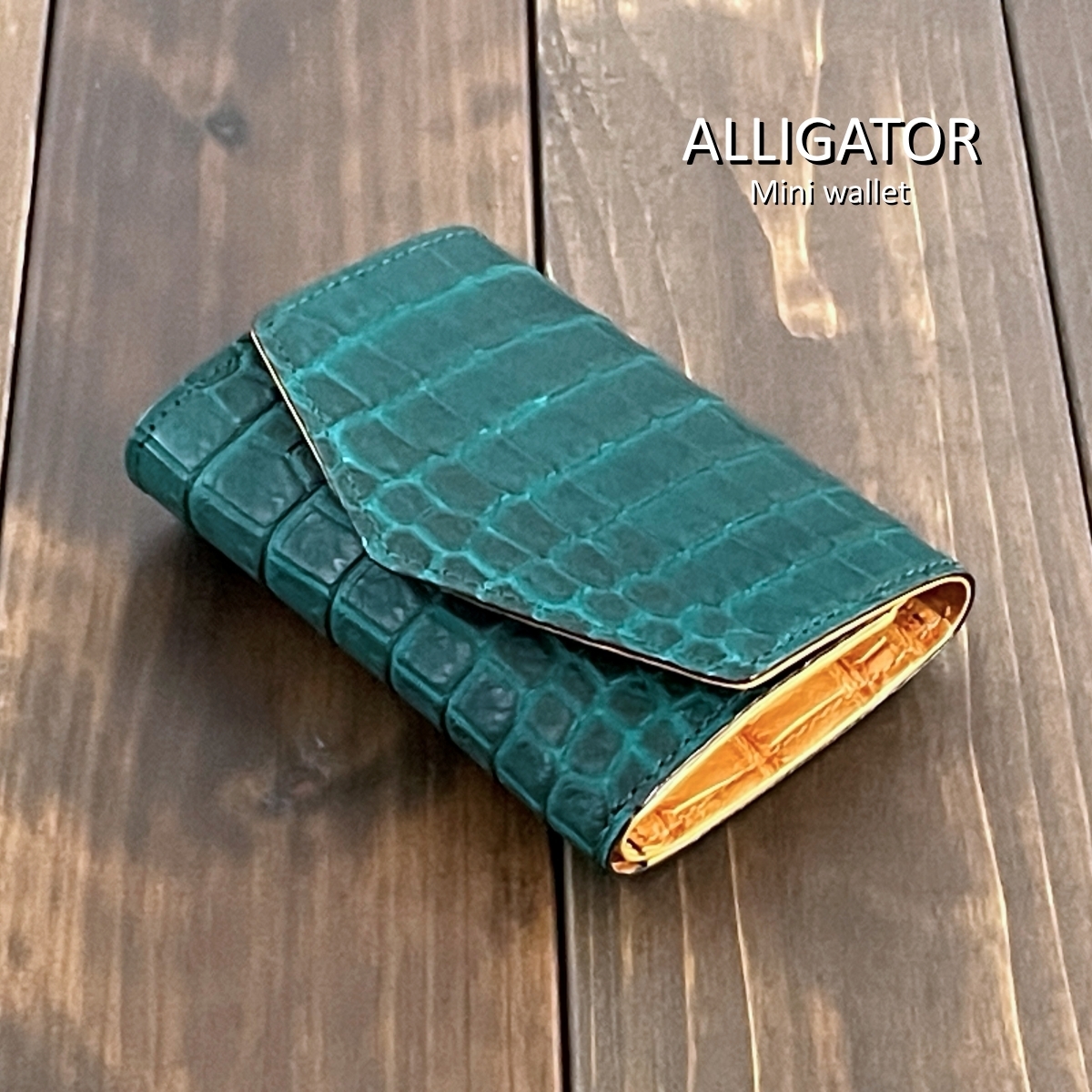 - ALLIGATOR アリゲーター × マルゴー ミニウォレット アンティークグリーン × コニャック 艶マット 加工 緑 ワニ革 クロコダイル 財布