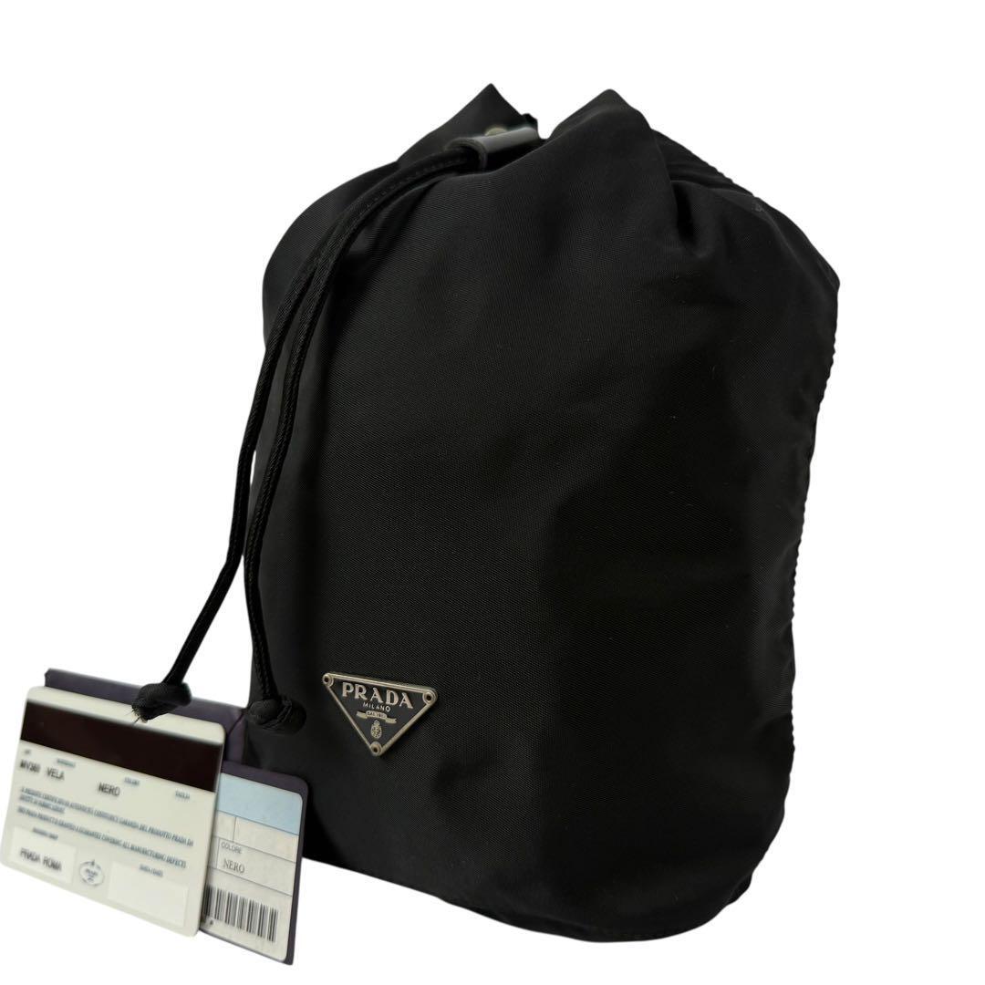 - 【美品・Gカード付き】PRADA プラダ 巾着ポーチ バニティ ミニカバン 化粧道具入れ 三角ロゴプレート テスートナイロン 黒 ブラック MV369