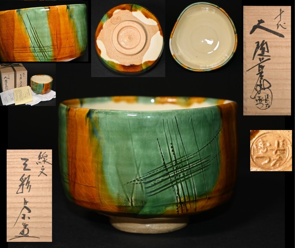 > 真贋保証■十代大樋長左衛門(年朗)造■ 線文三彩茶碗 共箱・共布・栞付 大樋焼 茶道具 抹茶茶碗 茶器 茶会 石川県金沢市 古美術