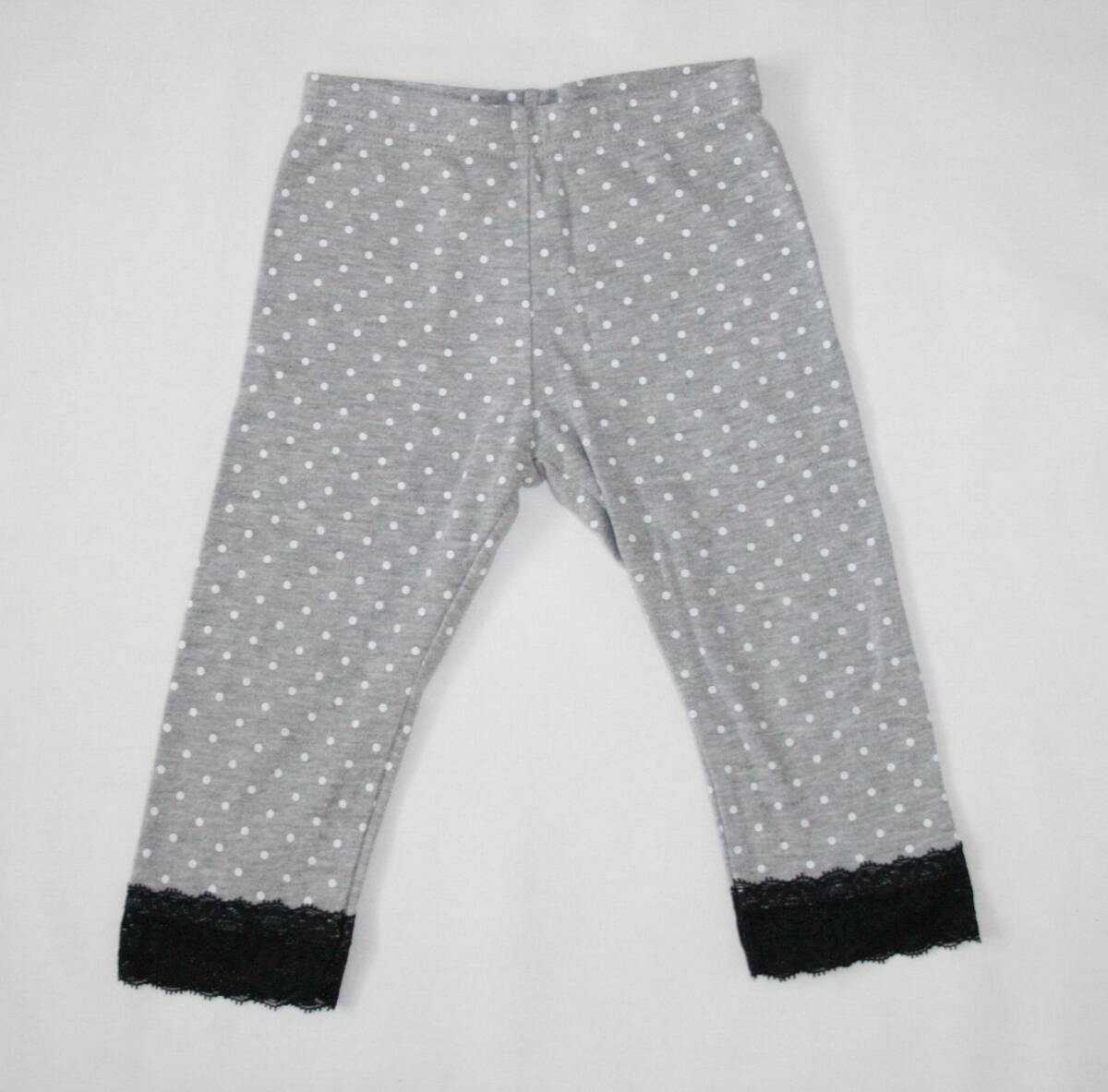 - 綺麗 良品 便利 グレーに白水玉 スパッツ レギンス 裾に幅広 黒ラッセルレース 100㎝ 95㎝ 90㎝