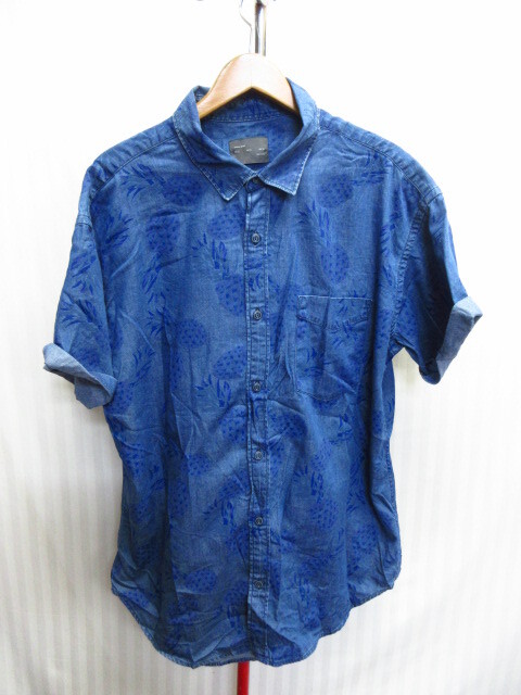 > ZARA MAN ザラマン パイナップル柄デニムシャツ メンズXL LL インディゴシャツ アロハシャツ ハワイアンシャツ シャンブレーシャツ08081