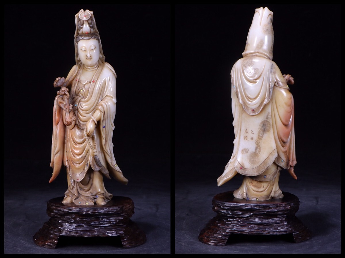 - 「清 友枝 老寿山石 芙蓉石彫り 如意観音擺件」極細工 擺件 古賞物 中国古美術 旧蔵出