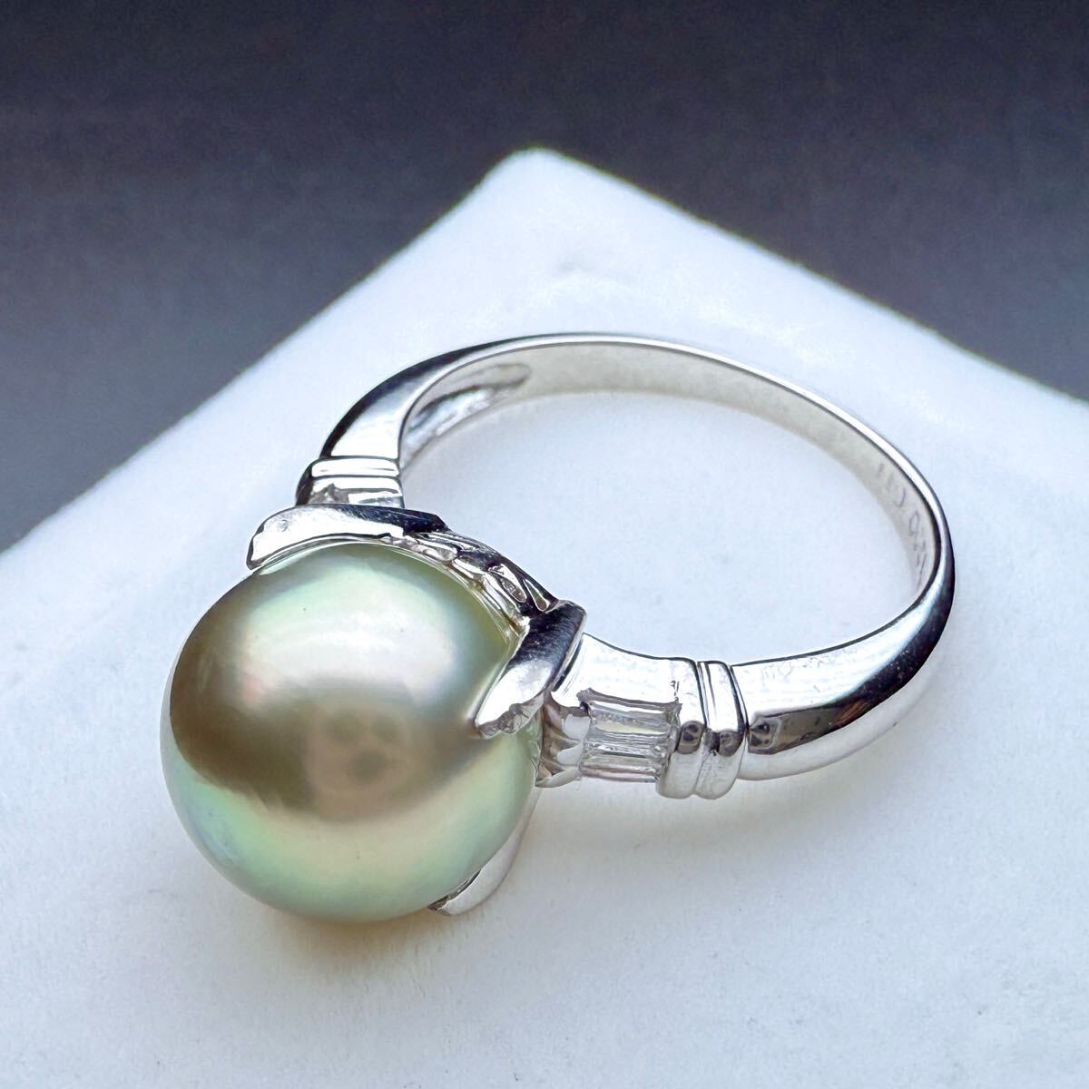 - 照り◎ ピーコックグリーン 黒蝶真珠 指輪 9.71㎜ 10号 5.6g ダイヤモンド 0.11ct Pt900 プラチナ リング クロチョウ アクセサリー
