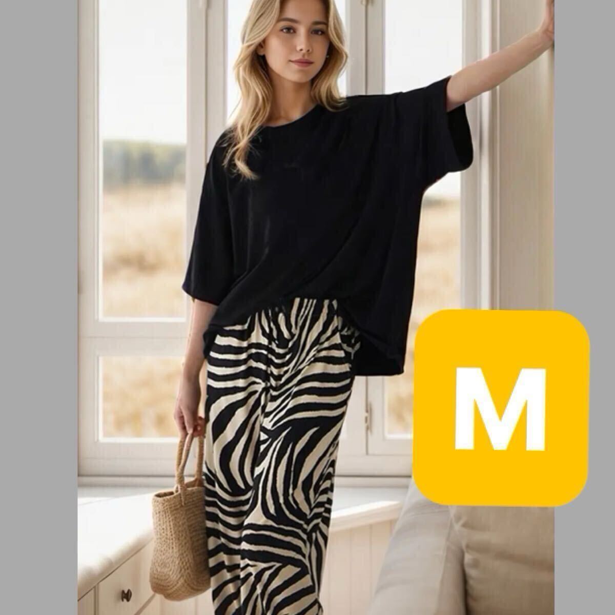 - セットアップ レディース パジャマ カジュアル 半袖 ロングパンツ セット ゼブラ プリント 高級 ホームウェア ツーピース セット #M