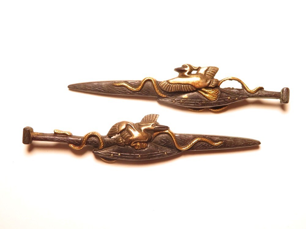 - 【11232】刀装具 江戸~明治 赤銅地 鵜飼 目貫(初品・買取品)