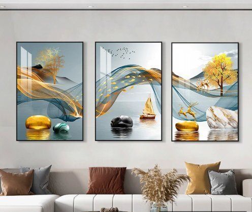 - 北欧の居間の装飾の絵三連ソファの背景の壁の掛け絵現代のシンプルな大気のレストランの壁画寝室の壁の絵です