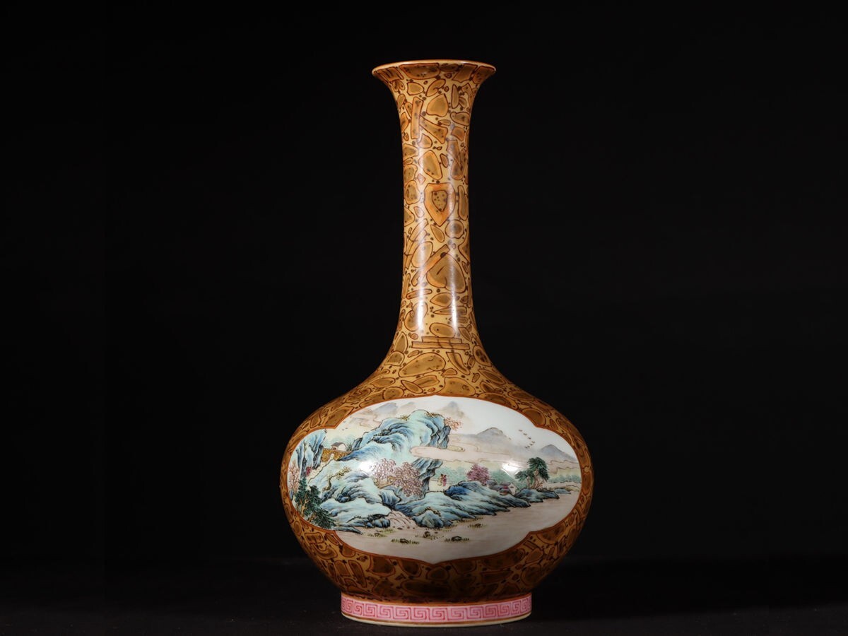 - 「清 雍正年製 陶磁器 粉彩開光卵石紋釉 長頸瓶」染付 置物 擺件 古賞物 中国古美術 旧蔵出