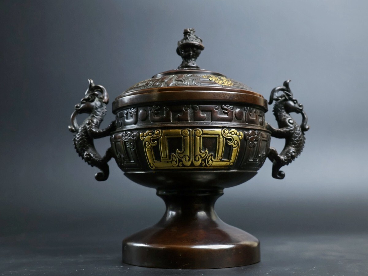 - 「明代 大明宣徳年製 古銅彫 塗金龍紋 獣耳老銅香薰炉」旧銅器 置物擺件 賞物 中国古美術 旧蔵出