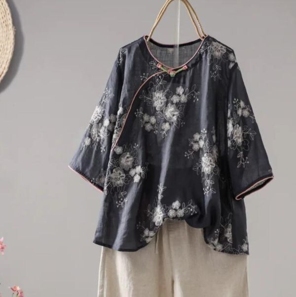 - 新入荷*上質 刺繍 チュニック レディース シャツ ブラウス ゆったり トップス 大きいサイズ お花刺繍り オフィス 通勤 ブラウス * 紺