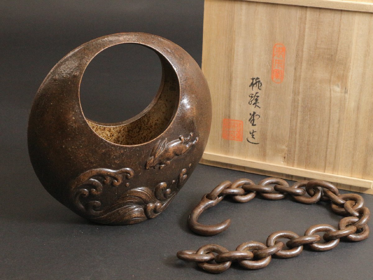 ・備前焼 桃蹊堂 白波兎文 釣花入 共箱 /花瓶 花器 華道具 茶道具 |