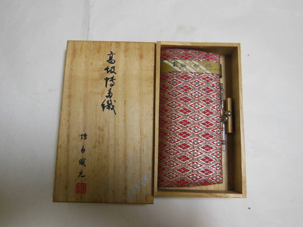 - 日本製 未使用品 伝統工芸品 本場博多織ガマ口開閉女性用小銭入れ・コインケース 絹100% 木箱付き 送料無料