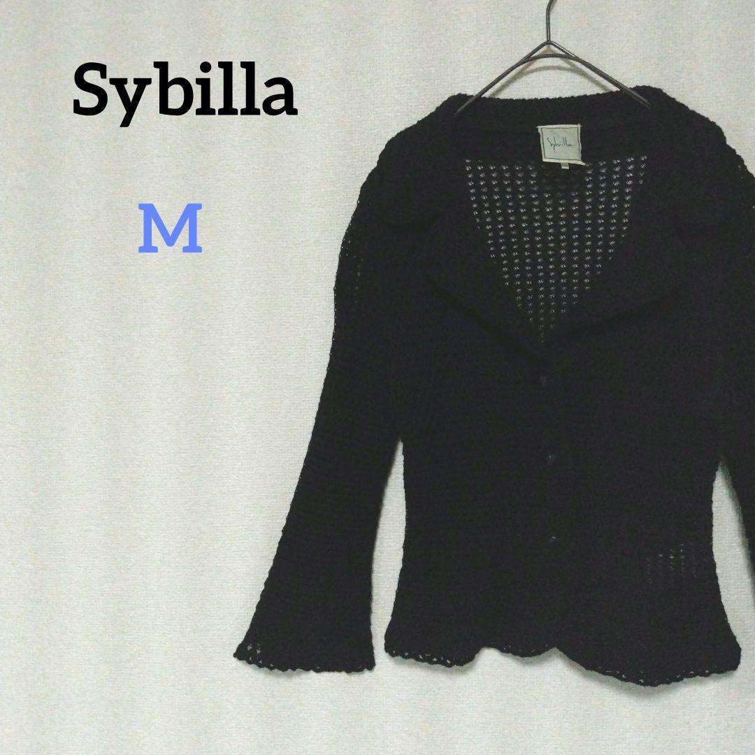 - Sybilla シビラ ニットジャケットカーディガン シースルー フレアスリーブ コットン ブラック 透け感 羽織 黒 綿 M