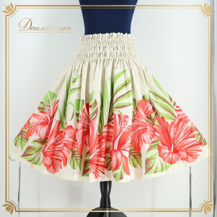 - フラダンス 衣装 パウスカート アイボリー系 フラ ダンス 花柄 ハワイアン ハレハワイイ 白 赤 緑 茶 レッスン シングル ハイビスカス柄