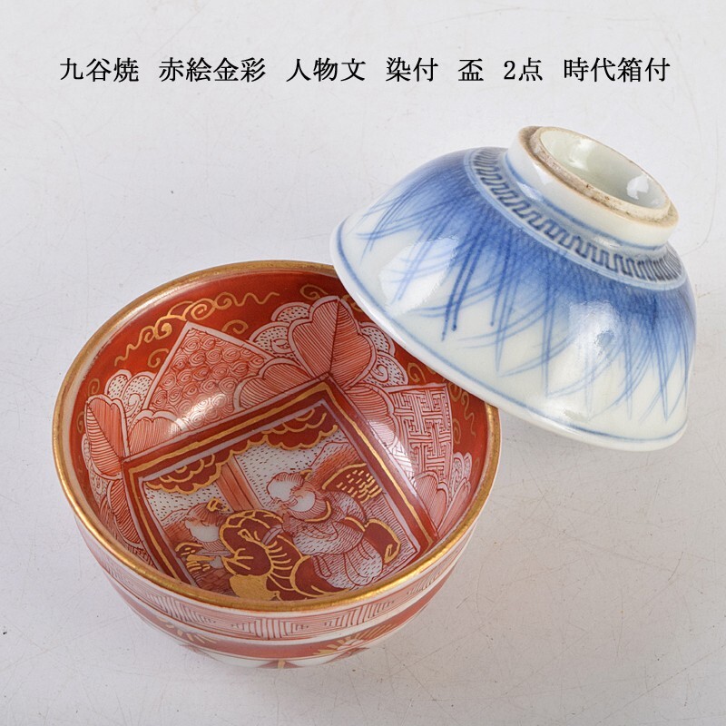 - 九谷焼 赤絵金彩 人物文 染付 盃 2点 時代箱付 MVRF