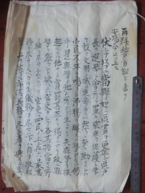 - 二本松藩領二本松町古文書●明治7年(1874) 再拝○首謹ンテ書ヲ安場令ムニ上々 3丁 大谷武 現在の福島県二本松市 250819