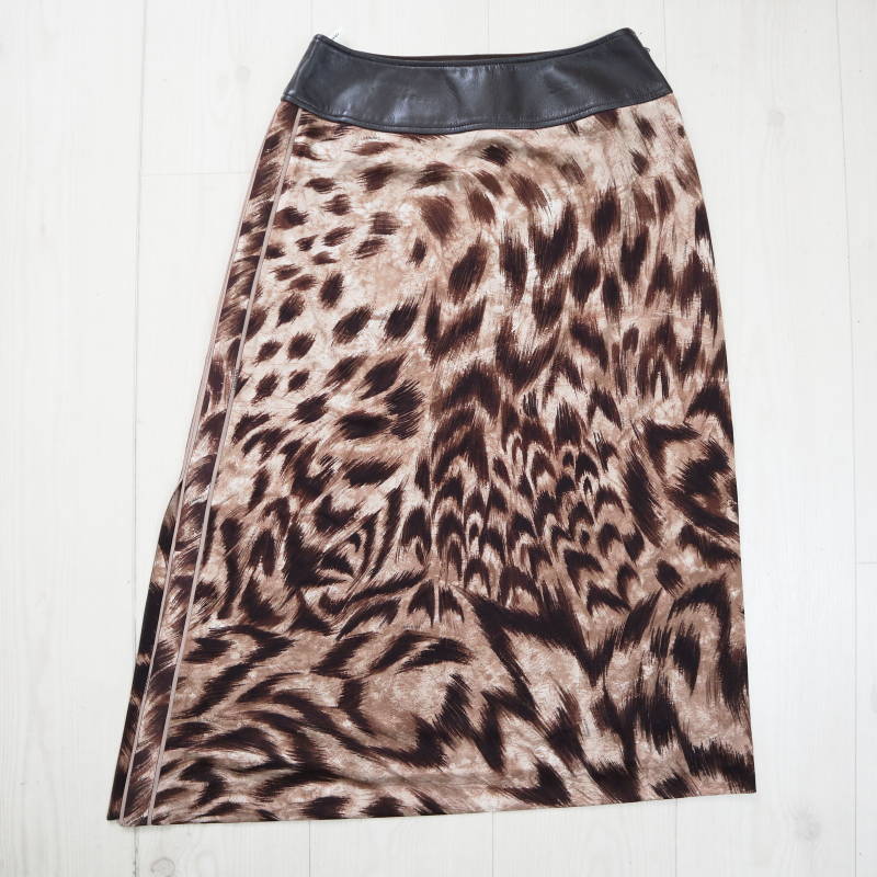 > LEONARD レオナール 総柄アセテート/ポリエステル/シープスキン ロングスカート サイズ67 ブラウン S08-k067