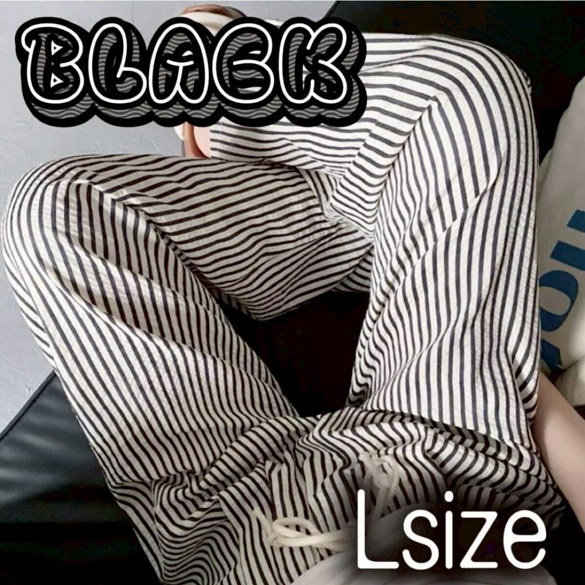 - 体型カバー ストライプ ワイドパンツ レディース 薄手 楽ちん 韓国 黒 L