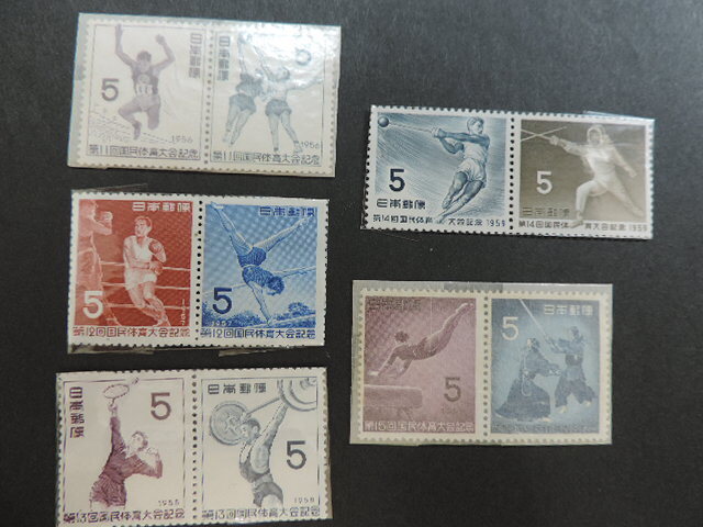 > ★国民体育大会記念 ★ 第11回、12回、13回、13回、15回 1956年~60年 5円切手×10枚 新品・未使用