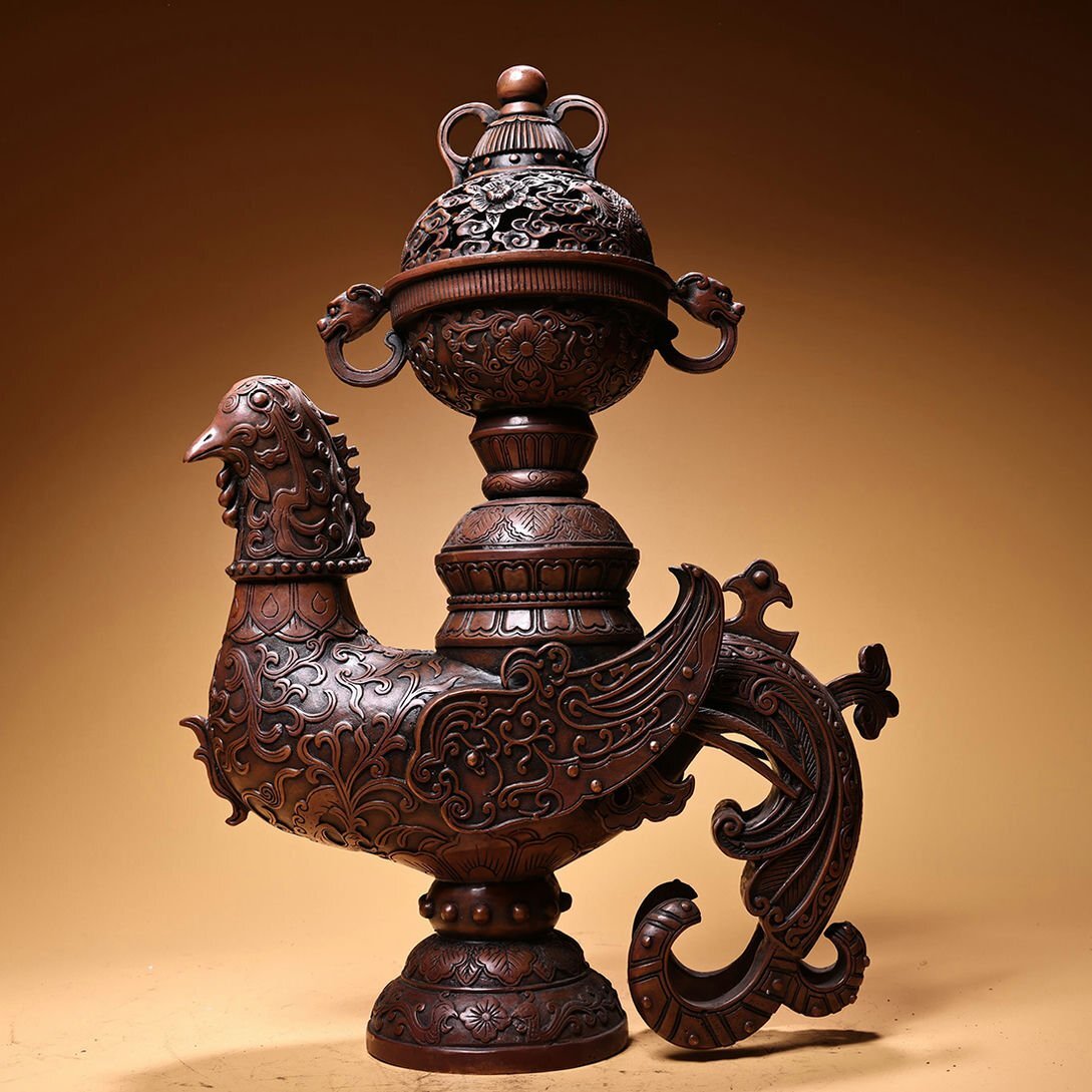- ◆羽彰・古美術◆Y0647清時代 銅製高浮彫鏨刻鳳尊 細密細工★古置物★古賞物★古擺件★蒐集家放出★唐物