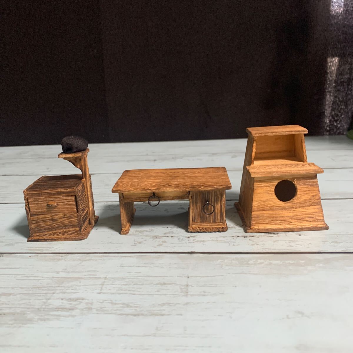 > ミニチュア アンティーク 家具 木製 レトロ ドールハウス おもちゃ 裁縫箱 古道具 踏み台 テーブル 机 3個セット (A-2510)