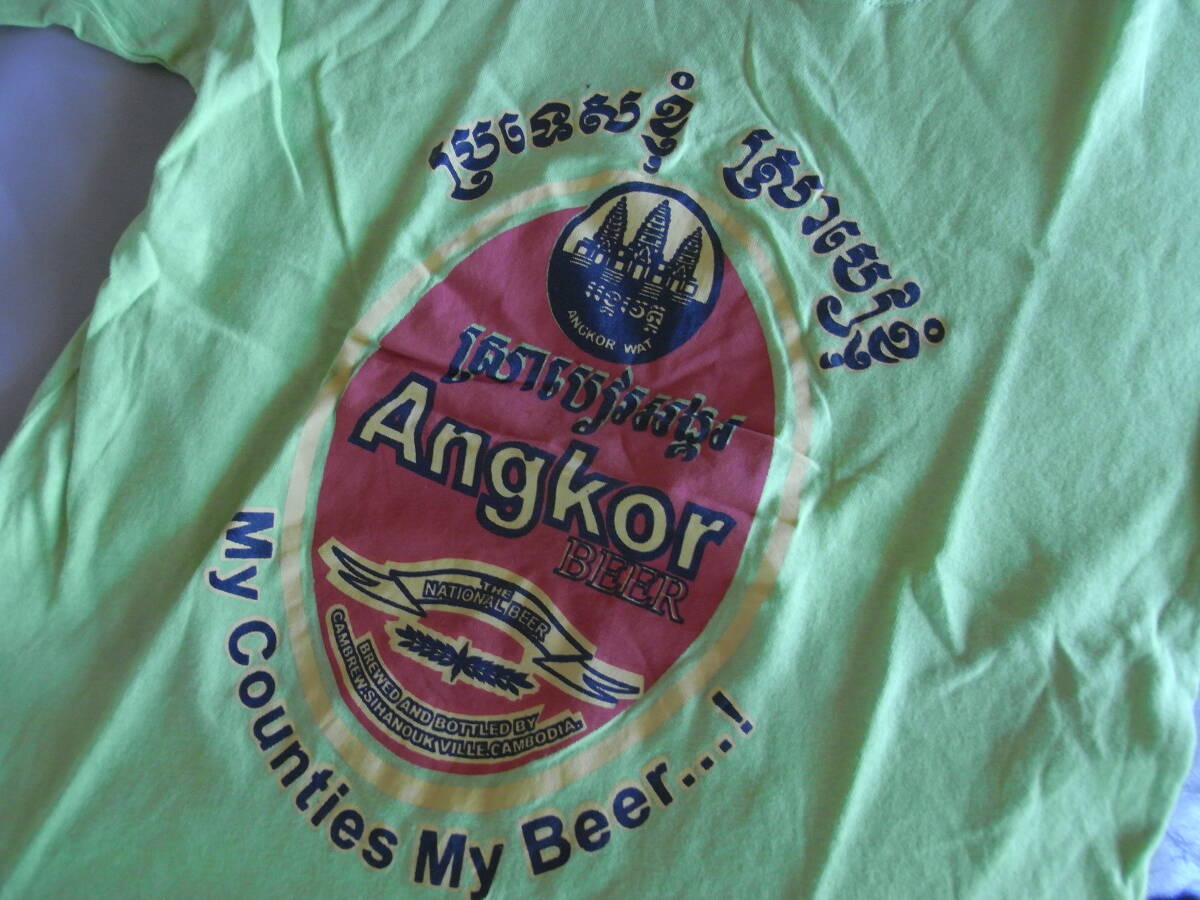 > 一度洗濯/未着用 カンボジア☆アンコールビールデザインの男性用Tシャツ Sサイズ 黄緑色