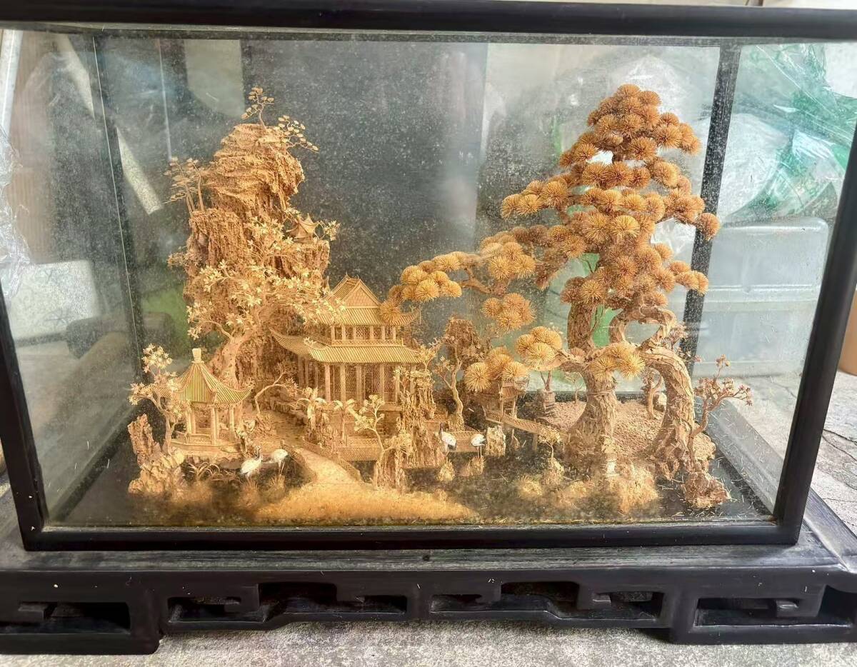 - 【店舗受取限定】 発送不可 神戸市 中国古玩 古美術 コルク細工 工芸品 精密彫刻 置物 オブジェ 楼閣山水 唐木台 ガラスケース