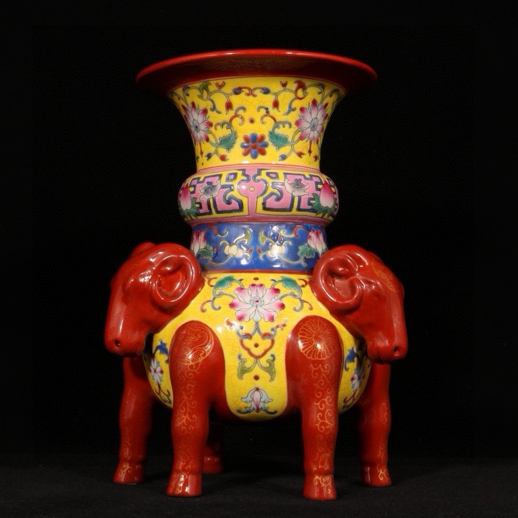 > 清時代 乾隆年制 エナメル彩 描金三陽開泰 三羊尊 陶磁器 中国美術 唐物 古美術 置物 高さ21 cm 直径15 cm 820