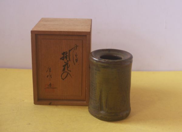 - 茶道具 備前焼の掛花入れ 竹掛花入 信水造 耳付き花器 桐箱付き/27N8.7-49