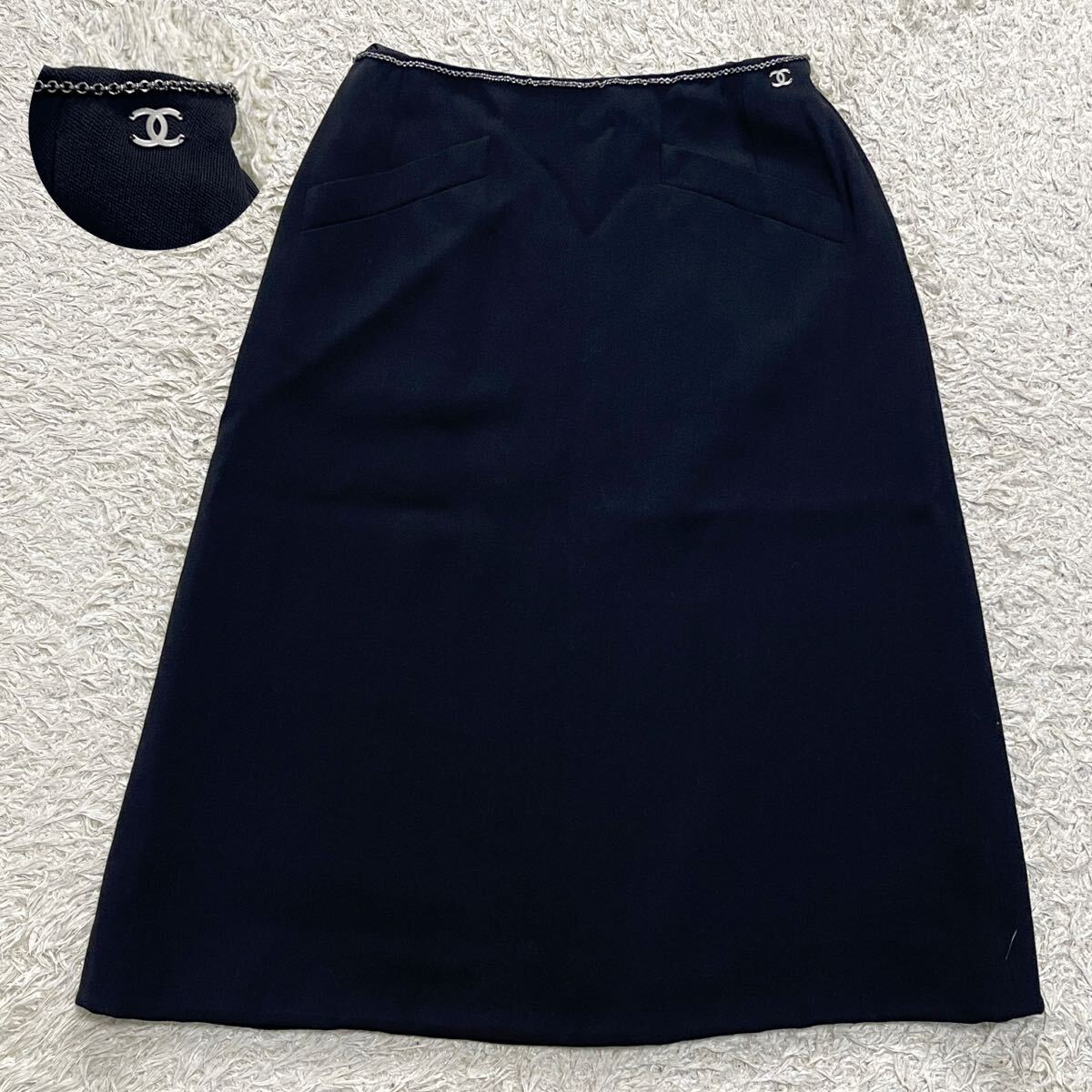 > 《美品》シャネル ココマーク チェーン 膝丈スカート CHANEL リネン ウール 36 Sサイズ相当 ブラック 黒色