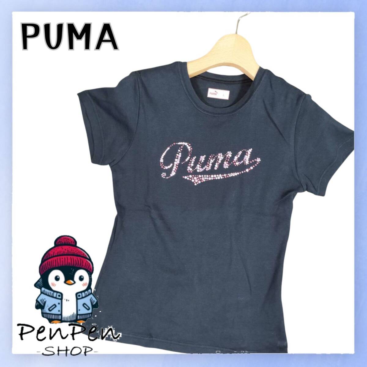 - 日本製 PUMA プーマ レディース Tシャツ スワロフスキー風 ロゴプリント ブラック 綿100% Lサイズ カジュアル 高級感 ラメロゴ