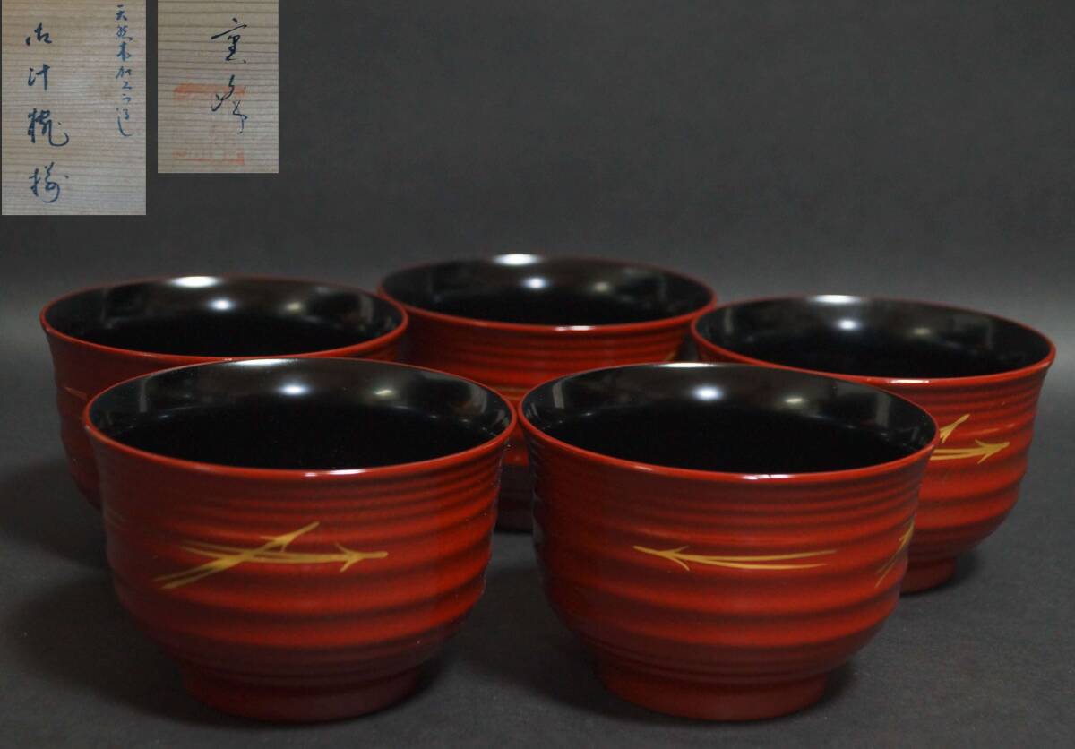 - 【芸】木製 漆塗 重峰作 金蒔絵『松葉散らし』吸物椀 汁椀 懐石道具 共箱 五客セット s70821