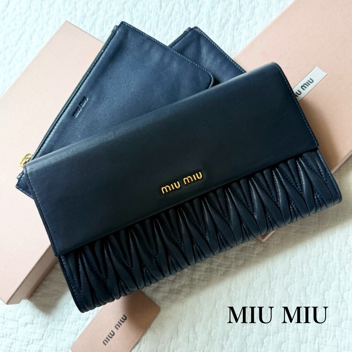 - 美品 miu miu ミュウミュウ クラッチバック ポーチ レディース マテラッセ ネイビー ゴールド レザー 長財布 5M1403