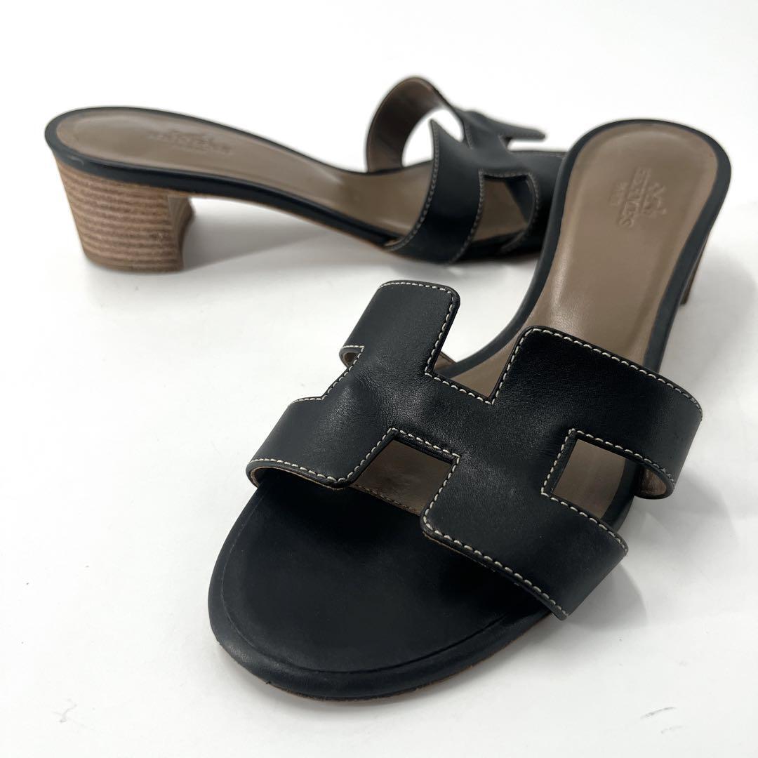 > HERMES エルメス オアジス 厚底サンダル Hモチーフ バイカラー レザー 36 約23cm ブラック Hロゴ ミュール