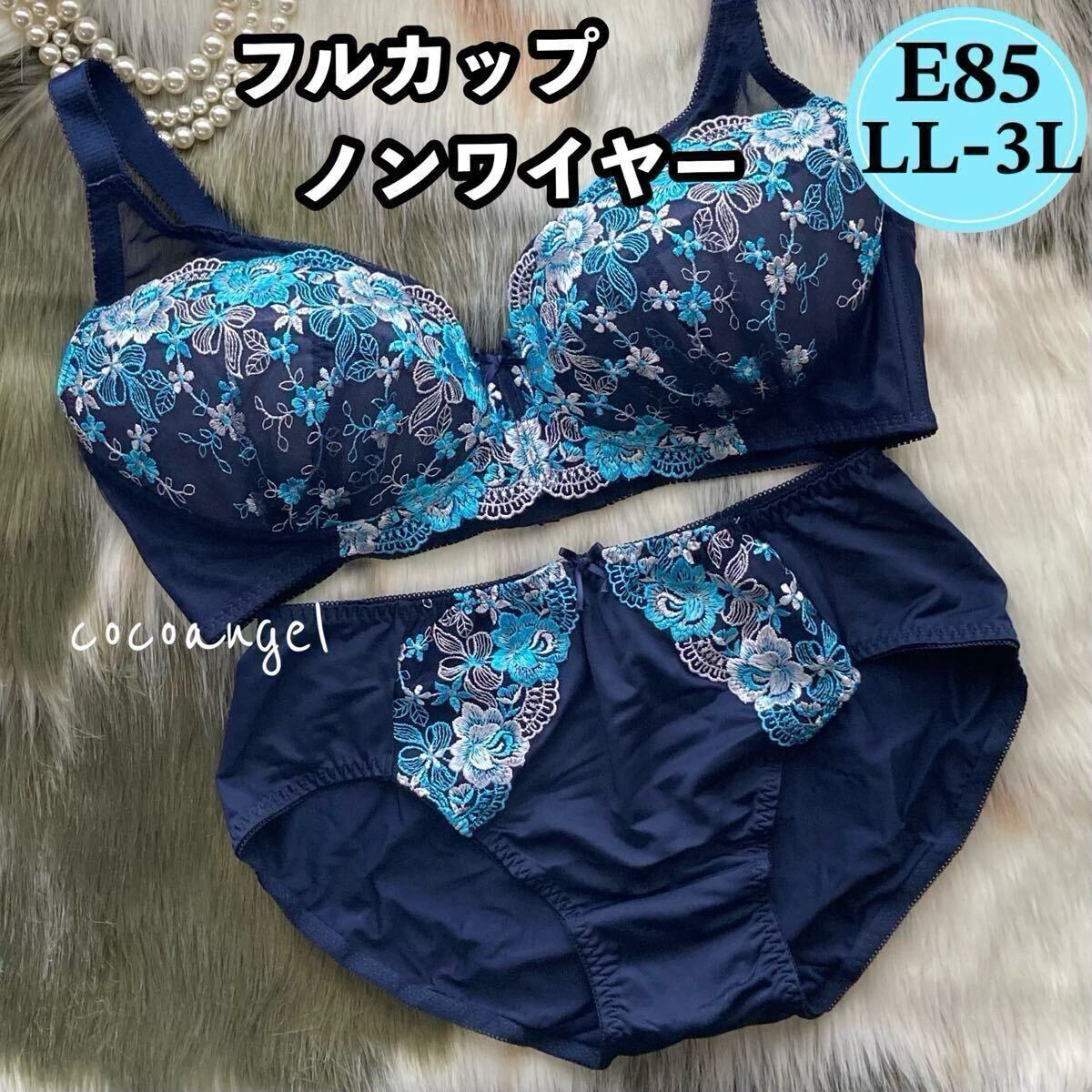 - ラスト【E85 LL-3L 紺 ノンワイヤー】新品 フルカップ ブラジャーショーツ Eカップ 女装 パッドなし パンティ 花柄刺しゅう 大きいサイズ