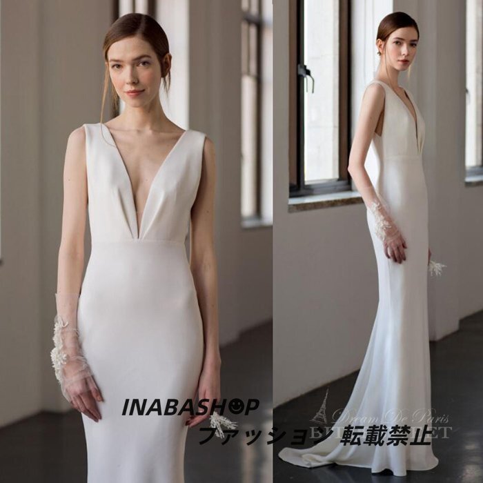 - 背中空き ノースリーブ ウェディングドレス ディープ vネック 袖なし ウエディングドレス マーメイドドレス 披露宴 結婚式 海外挙式 ドレス