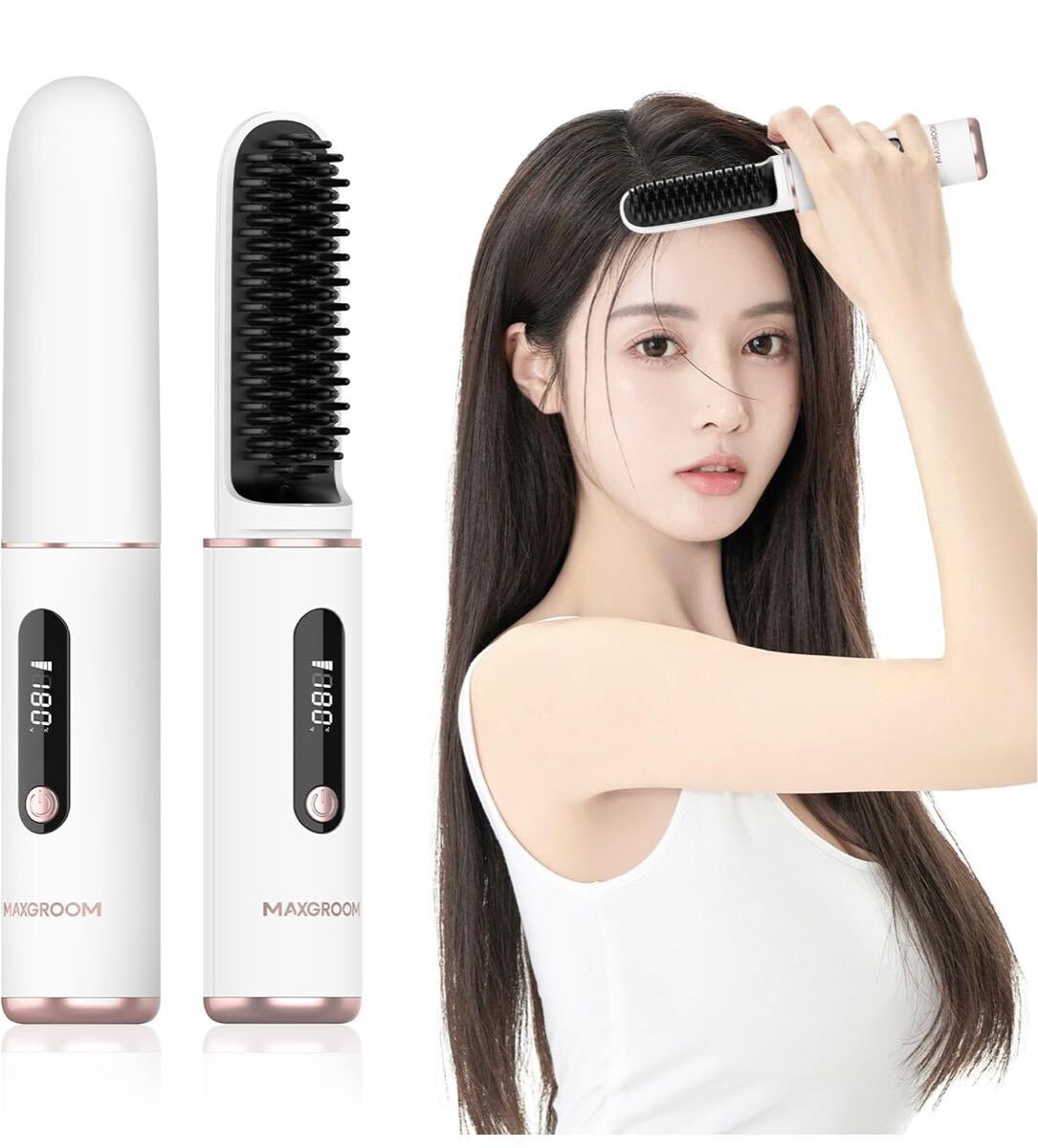 - ヒートブラシ コードレス [140℃~200℃温度調整&マイナスイオン機能] ブラシアイロン ストレート LEDパネル 静電気防止 火傷防止ヘアケア