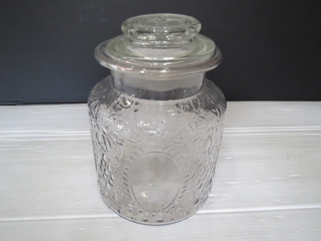 - 和ガラス 当時物 キャンディーポット あめや瓶 プレスガラス 丸窓にぶどう 無傷 高16.5㎝